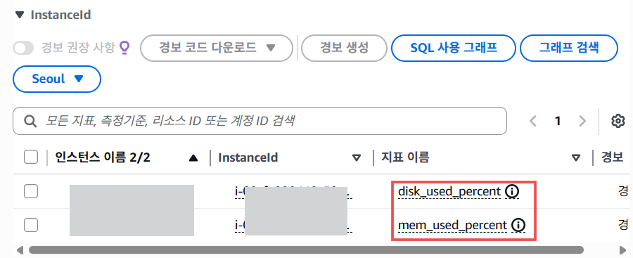 설정이 잘 되었다면 5분 뒤에 "CloudWatch > Metrics"에서 사용자 지정 네임스페이스 하위에 있는 `CWAgent` 네임스페이스를 확인할 수 있다. 이 네임스페이스에서 메모리 및 디스크와 관련된 지표를 확인할 수 있다.