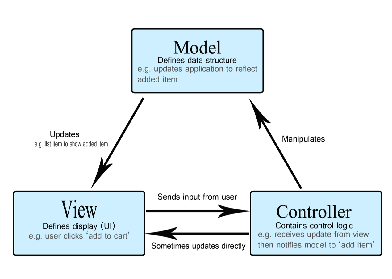 - 사용자 인터페이스, 데이터 및 논리 제어를 구현하는 데 사용되는 소프트웨어 디자인 패턴