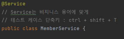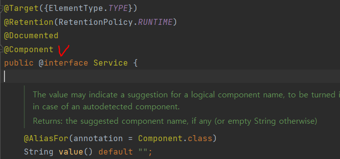 위 사진은 @Service 코드로, 위에 @Component 어노테이션이 부여되어있는 것을 볼 수 있다. 따라서 MemberService Class에서 @Service만 부여되어 있어도 MemberService는 스프링 컨테이너에 Bean으로 등록이 된다. (@Controller, @Repository에도 @Component가 있음)