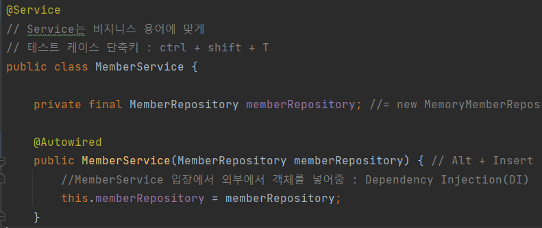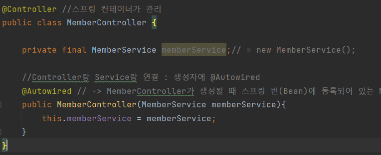 → 의존관계가 있다 : 멤버 컨트롤러가 멤버 서비스를 의존한다.