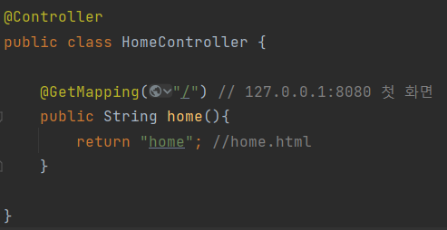 @GetMapping("/")은 localhost:8080의 첫 화면을 의미한다. 스프링의 @Controller에서 반환 타입이 String인 경우 Spring + View template을 사용하는 것이다. 따라서 home 메서드의 return "home"은 home.html을 의미한다.