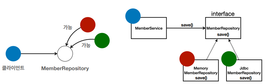 클라이언트인 MemberService는 인터페이스(역할)인 MemberRepository를 의존하고(아는 상태) 있고, 그 구현체인 MemoryMemberRepository 또는 JdbcMemberRepository를 의존하지 않고(모르는 상태) 할당받을 수 있다. 단지 인터페이스를 알면 해당 인터페이스를 구현한 객체는 무엇이든 받을 수 있다(협력).