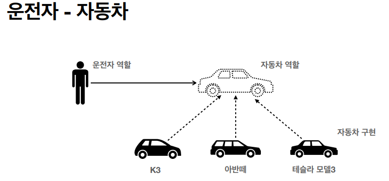 세상을 역할과 구현으로 구분해보자. 운전자(역할)는 자동차(역할)의 종류가 어떤 것이던 간에 운전이 가능하다. 예를 들어 운전자가 K3(구현)에서 테슬라(구현)로 차를 바꿨다고 해서 운전이 불가능하지 않다.