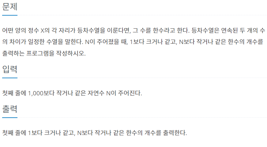 // 4. 입력값은 1000 이하의 숫자, 1000은 한수가 아니므로 세 자리 숫자가 등차수열인지 확인