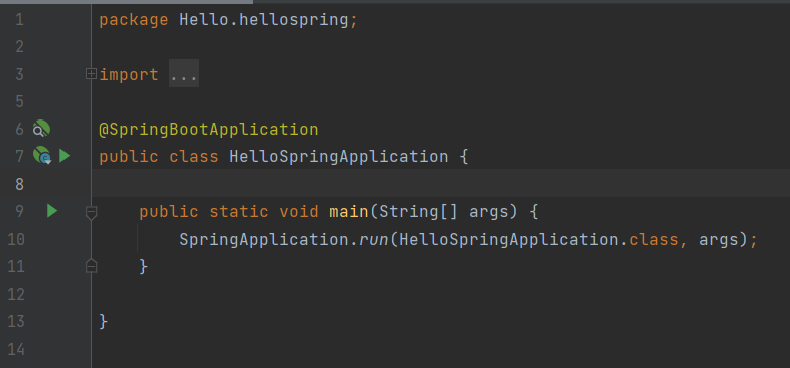 main 메소드 실행 : SpringApplication.run에 HelloSpringApplication 클래스를 넣어주면 @SpringBootApplication 어노테이션(annotation)으로 인해 스프링부트 어플리케이션이 실행됨 -> tomcat 웹서버를 내장하고 있어서 자체적으로 톰캣 웹서버를 열면서 스프링부트가 같이 올라옴