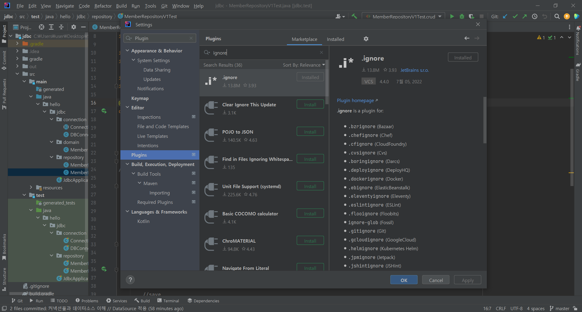 3번까지 진행하고 나면 git과 연동은 성공적으로 완료된 것이다. 추가로 .ignore 플러그인을 설치하면 .ignore 파일을 쉽게 추가할 수 있다. [File] > [Settings]에서 Plugin을 검색하고 여기에서 ignore를 검색한다. 설치가 안되어 있으면 Install 버튼이 나타나고 눌러서 설치한다.