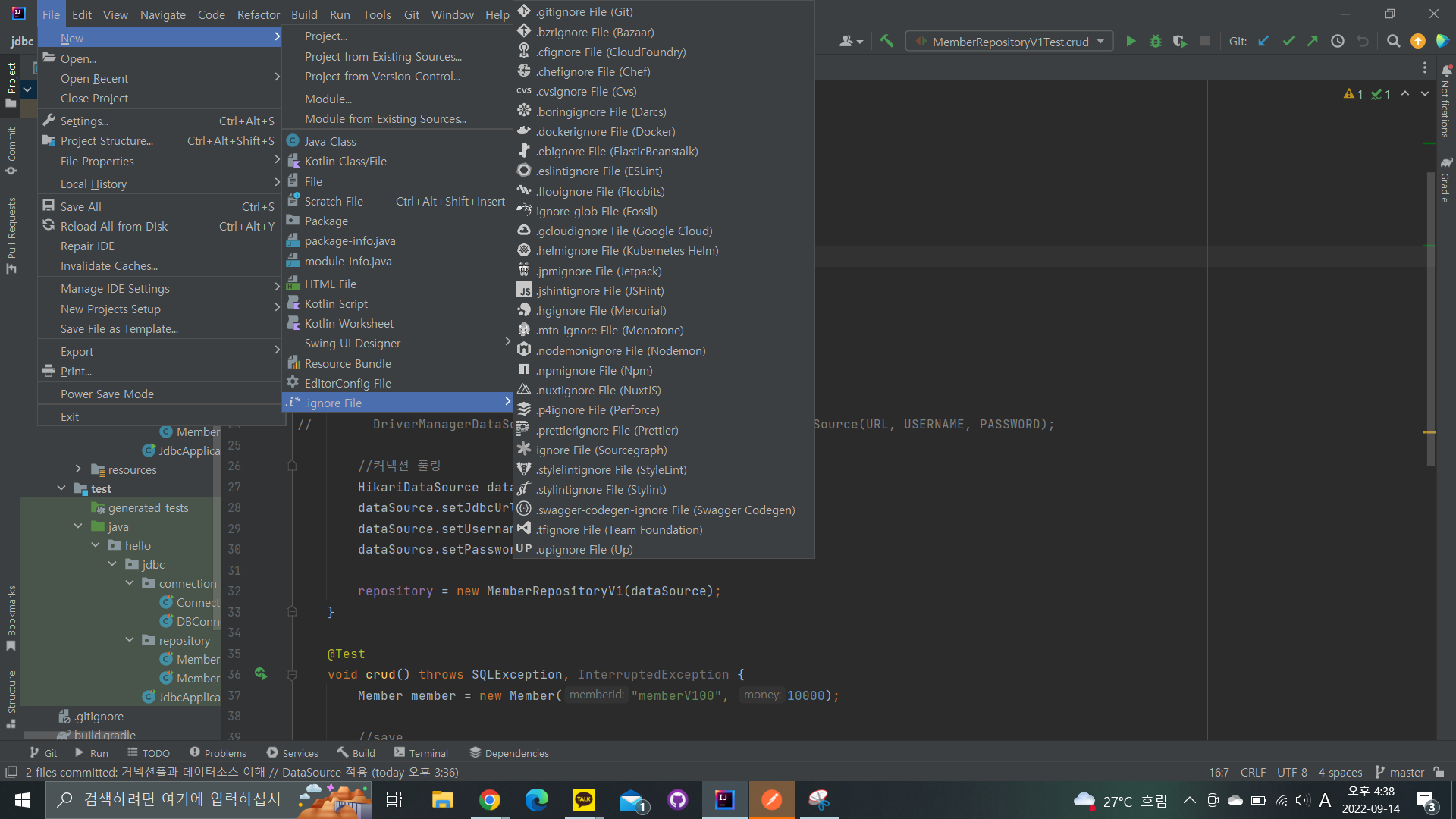 설치하고 나면 [File] > [New]에서 .ignore File을 볼 수 있다. 여기에서 .gitignore File(Git)을 클릭한다.