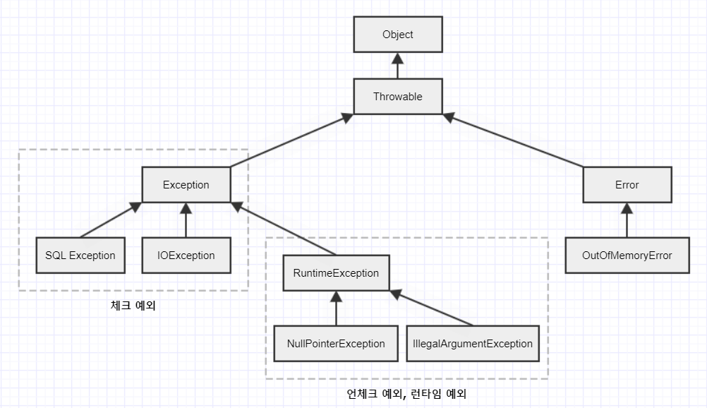 자바의 모든 객체의 최상위 부모는 object이다. 따라서 예외의 최상위 부모도 object이다. Throwable은 최상위 예외로 하위에 Exception과 Error가 있다. Error는 애플리케이션에서 복구가 불가능한 시스템 예외로 애플리케이션 개발자는 이 예외를 잡으려고 해서는 안된다. 상위 예외를 catch로 잡으면 그 하위 예외까지 함께 잡는다. 따라서 애플리케이션 로직에서는 Throwable 예외도 잡으면 안 되는데, Error 예외도 함께 잡을 수 있기 때문이다. 애플리케이션 로직은 이러한 이유로 Exception부터 필요한 예외로 생각하고 잡으면 된다. (Error도 언체크 예외)