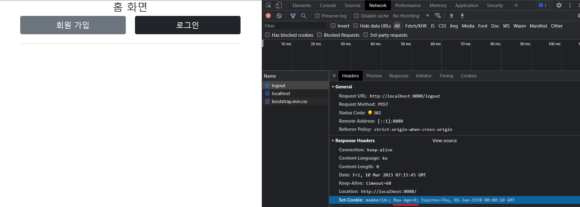 위 사진은 로그아웃한 화면이다. 로그아웃을 하고 Response Header의 Set-Cookie를 보면 Max-Age가 0인 것을 확인할 수 있다.