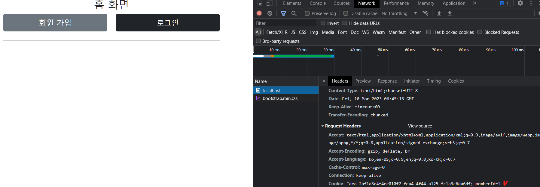 Application 탭의 Storage>Cookies을 클릭하면 memberId = 1을 볼 수 있다. 또한 Expires 항목을 보면 Session이라고 적힌 것을 확인할 수 있다.