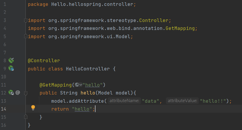 - model(인자)가 넘어오면 addAttribute("data", "hello!!") 실행 → "hello"(resources>templates>hello.html과 동일, 스프링이 hello.html을 찾아서 렌더링 함) 반환. 즉, hello.html 실행